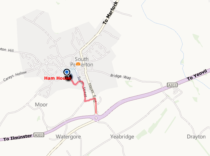 South Petherton is about 10 miles from Yeovil and 15 from Taunton. It is just off the 303, see map below. Turn off the 303 at the Hayes End/Petherton Roundabout and continue for a short distance until you come to a mini roundabout. Turn left into Coles Lane; go to the T juction at the bottom and turn right into South Street. Hele Lane is a sharp left turn about 400yds along South Street. Wind your way down the lane, after you cross the ford, Ham House is about 50 yards on the right. Look for the large dark green garage door and park there.